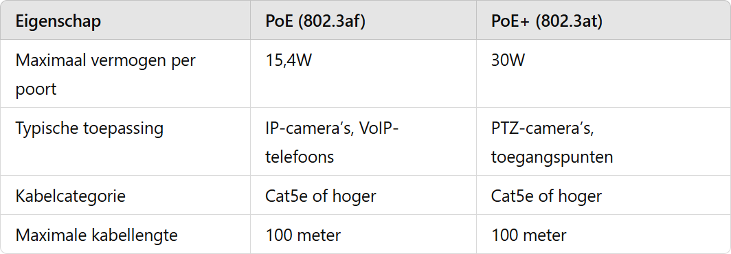 De keuze tussen PoE en PoE+ hangt af van het stroomverbruik van jouw netwerkapparaten.